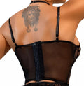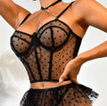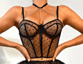 The Celeste Polka Dot Sheer Bustier in Black is the ultimate blend of elegance and allure. Featuring playful polka dots, a sheer mesh design, and delicate chain detailing, this bustier is a show-stopper. Adjustable straps and underwire support offer comfort and a perfect fit, ideal for creating a bold, confident look.
