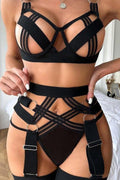 Unleash your bold side with this captivating lingerie set, featuring intricate crisscross elastic straps, a high-waist design, and adjustable garters for a seductive and customizable fit. Perfect for adding drama and confidence to your wardrobe, this set combines luxury and allure effortlessly.