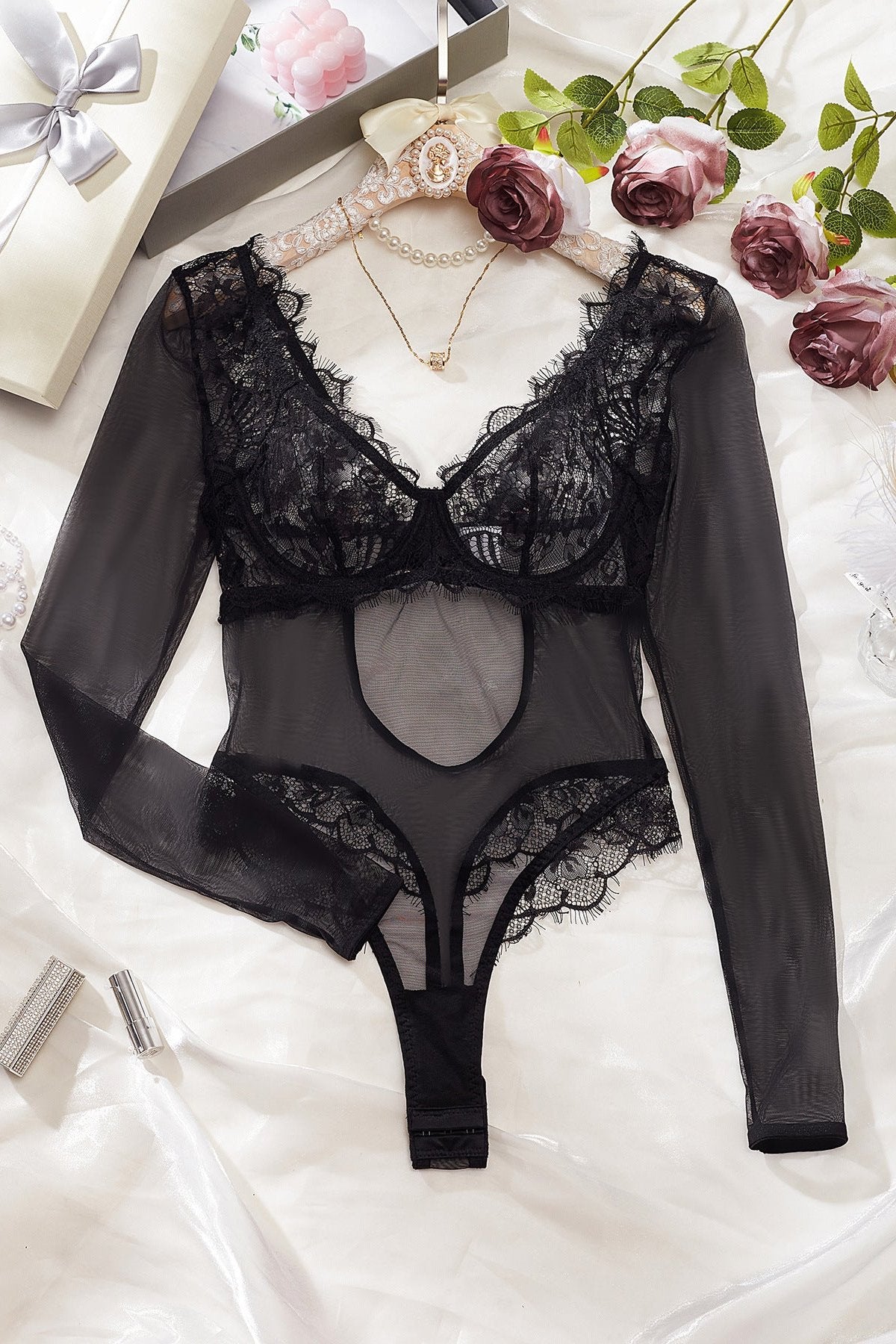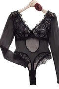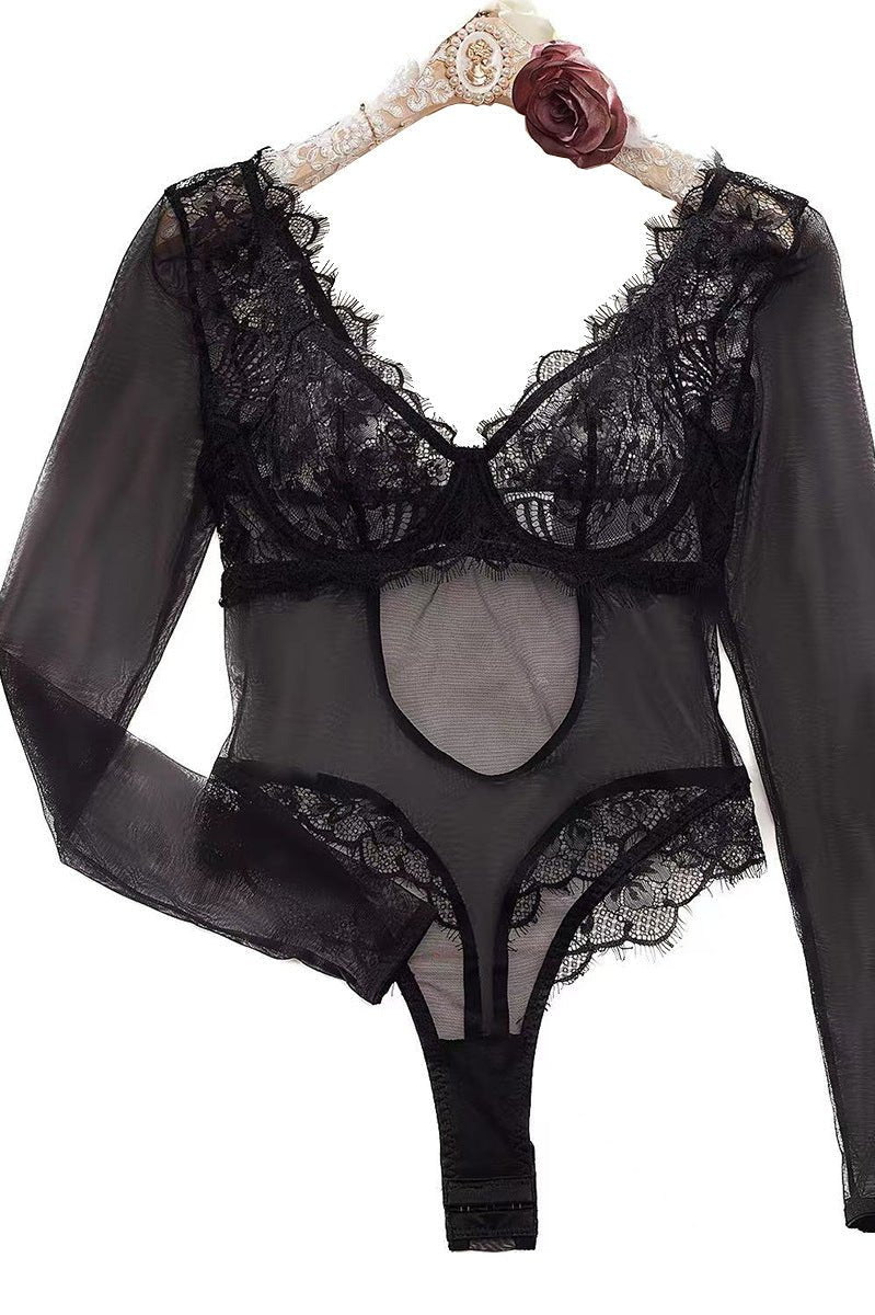 Unleash your inner seductress with the Scarlett Bodysuit, a stunning piece combining elegance and allure. Crafted from sheer mesh with delicate lace detailing, this long-sleeve bodysuit features an open back and underwire support, enhancing curves with a graceful fit. Perfect for intimate evenings or layering under a chic outfit, the Scarlett Bodysuit adds a touch of mystery and sophistication to your lingerie collection.