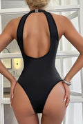 Exude confidence with this sleek halter-neck bodysuit, featuring a daring sheer mesh panel that adds allure to the minimalist design. The high-neckline and open-back detail create a sophisticated yet sensual silhouette. Crafted from smooth stretch fabric, this piece is perfect for evening wear or layered chic looks.