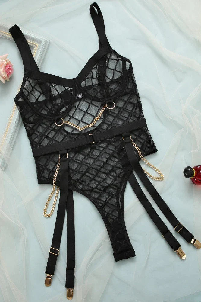 Step into something sheer and sultry with our Cleo bodysuit. This enchanting piece is made of delicate mesh with net pattern and gold chain details. Cleo will make hearts beat faster and is perfect for a special night in or a big night out.