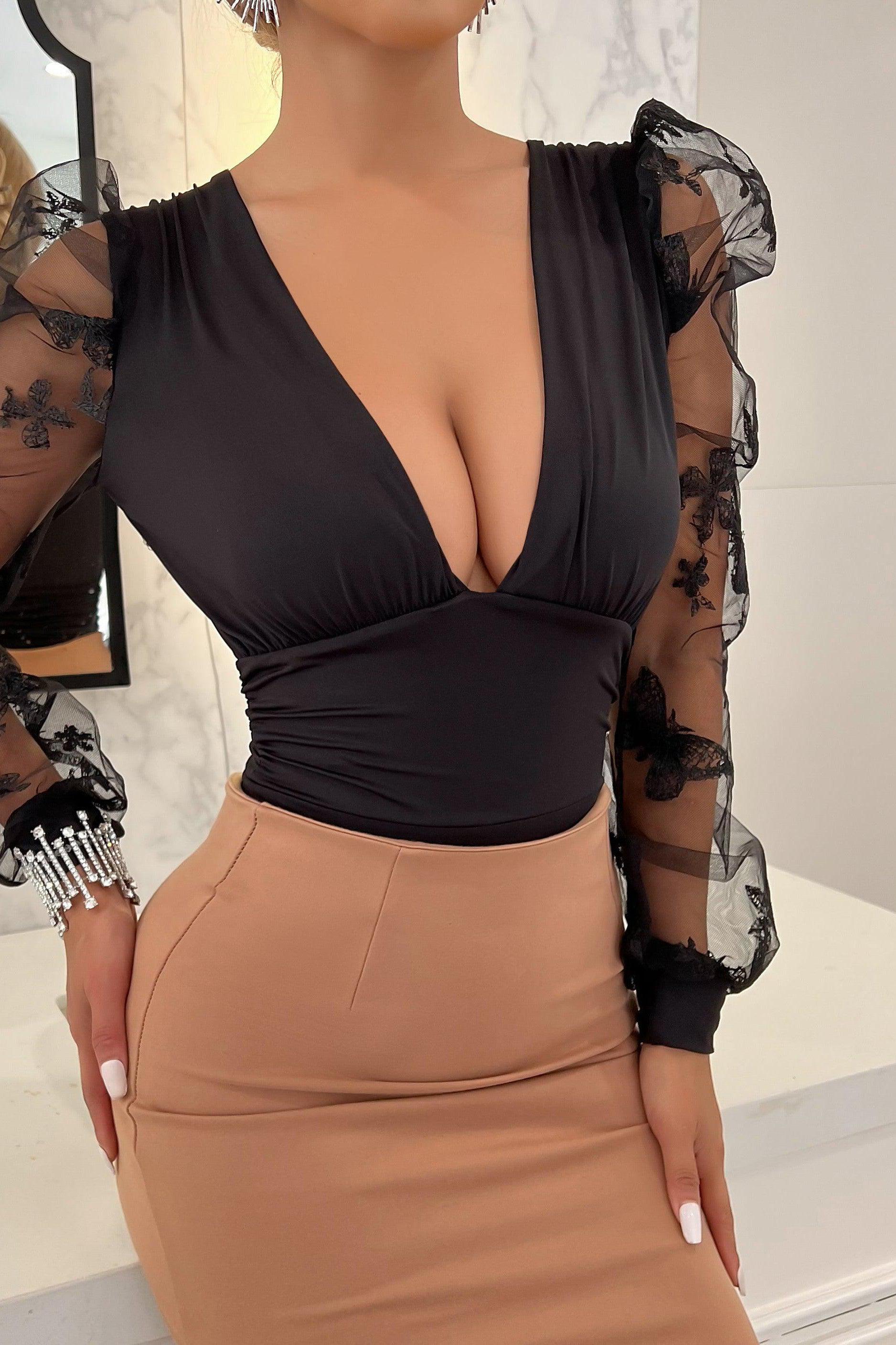 Exude elegance with this captivating bodysuit, featuring a plunging neckline and sheer puff sleeves adorned with intricate floral embroidery. The ruched waist enhances your silhouette, while the soft stretch fabric ensures a flattering and comfortable fit. Perfect for evening events or a touch of glamour in your everyday style.