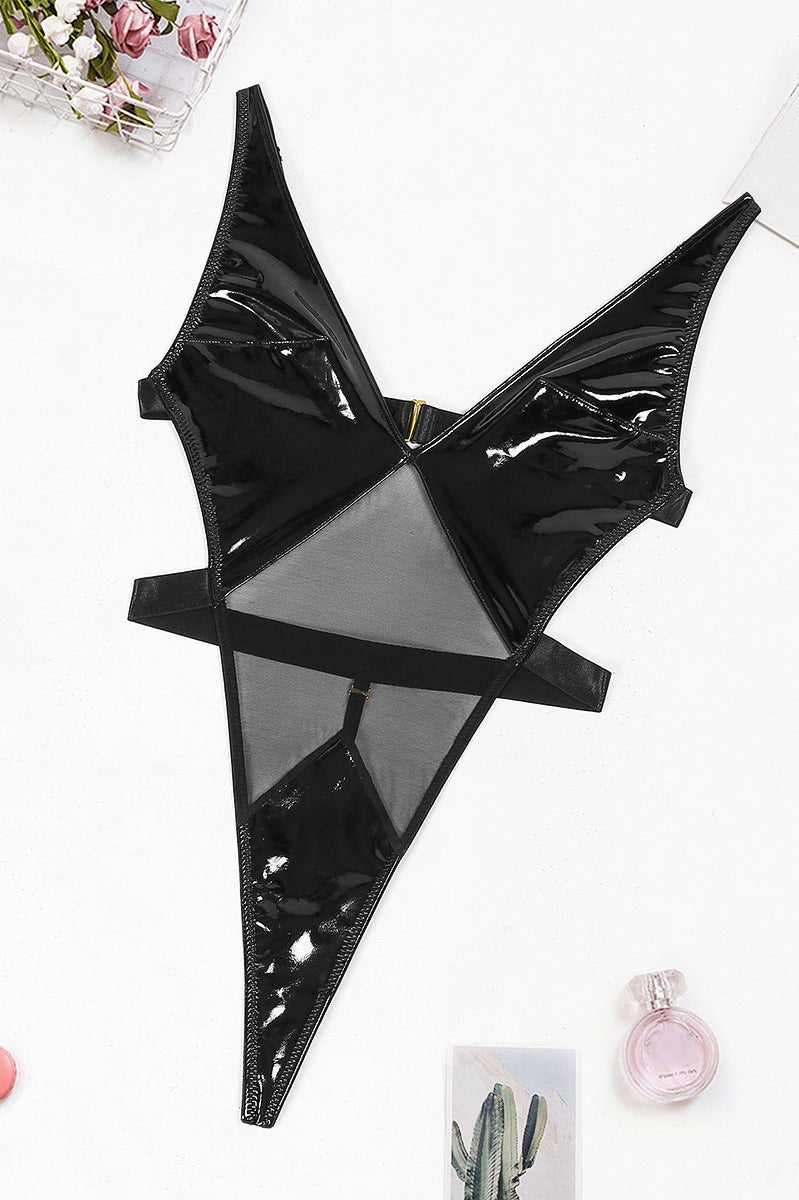 Embrace your wild side with the Ava deep V bodysuit, featuring a stunning mix of glossy faux leather and sheer mesh panels. The plunging neckline and open back create a daring silhouette, while the adjustable straps ensure a perfect fit. This seductive bodysuit is perfect for an unforgettable night of confidence and allure.