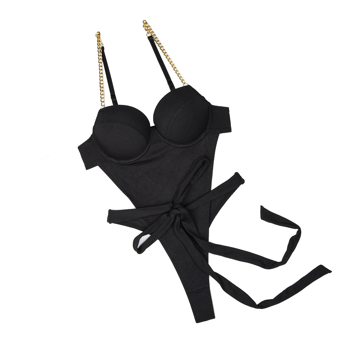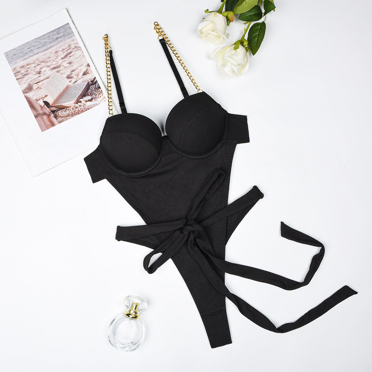 Sophia is the epitome of daring elegance. Featuring a sleek bodysuit design with gold-tone chain straps and a waist-accentuating tie detail, this piece is crafted to turn heads. Its form-fitting silhouette, combined with luxurious fabric and minimalist cutouts, ensures confidence and allure for any occasion.